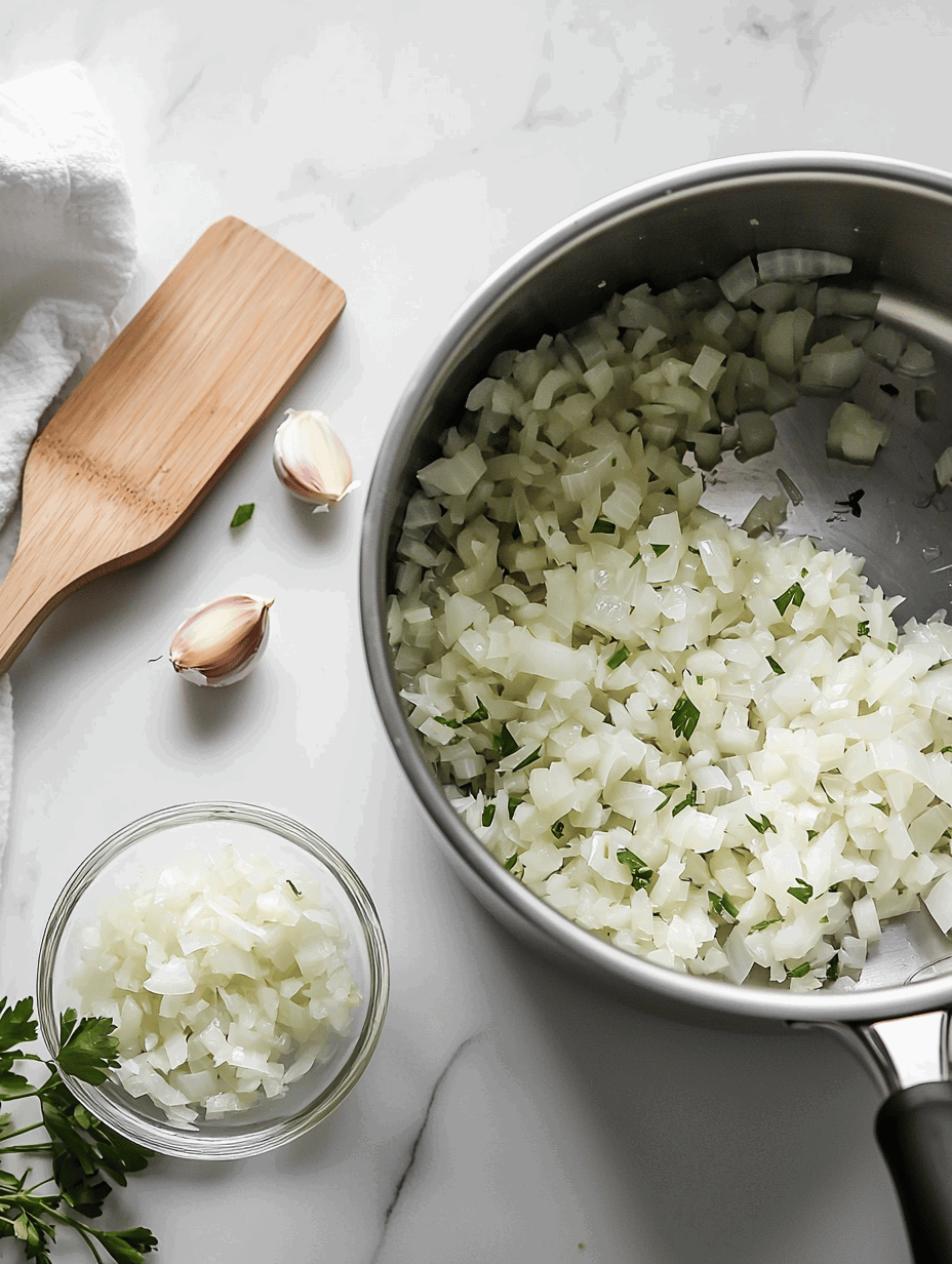 - While the sweet potatoes roast, heat a large pot over medium heat. Add a touch of oil if needed, then sauté the chopped onion until it becomes translucent and soft, about 5 minutes. Stir in the minced garlic and cook for another minute until aromatic.