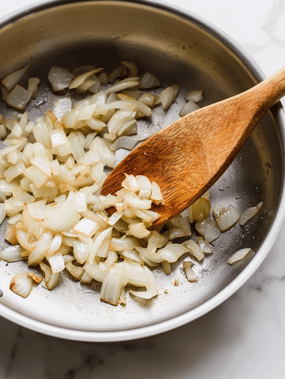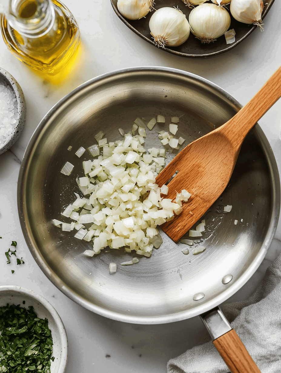 • In a large skillet or saucepan, heat the olive oil over medium heat. Add the chopped onion and sauté until it becomes translucent and fragrant, about 3-4 minutes.