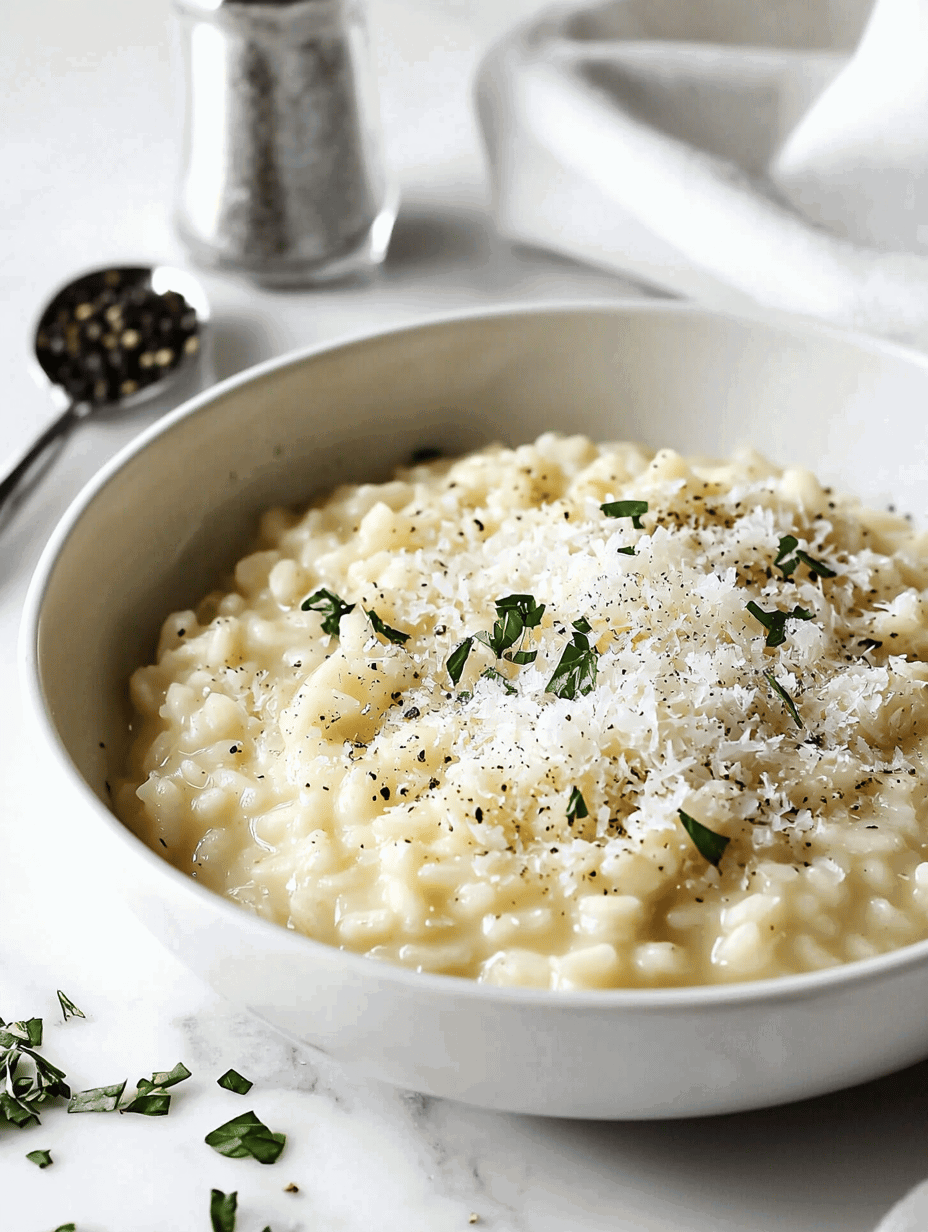 • Season the risotto with salt and pepper to taste, then stir in the grated Parmesan cheese for a silky finish.