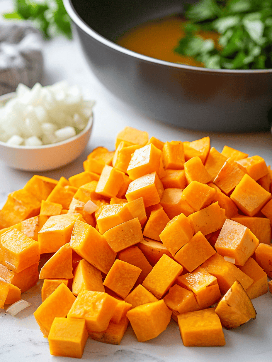 - Start by peeling and chopping the sweet potatoes and butternut squash into uniform pieces, ensuring even cooking. Sauté chopped onion and minced garlic in olive oil in a large skillet or directly in the slow cooker until fragrant and translucent, about 5 minutes.