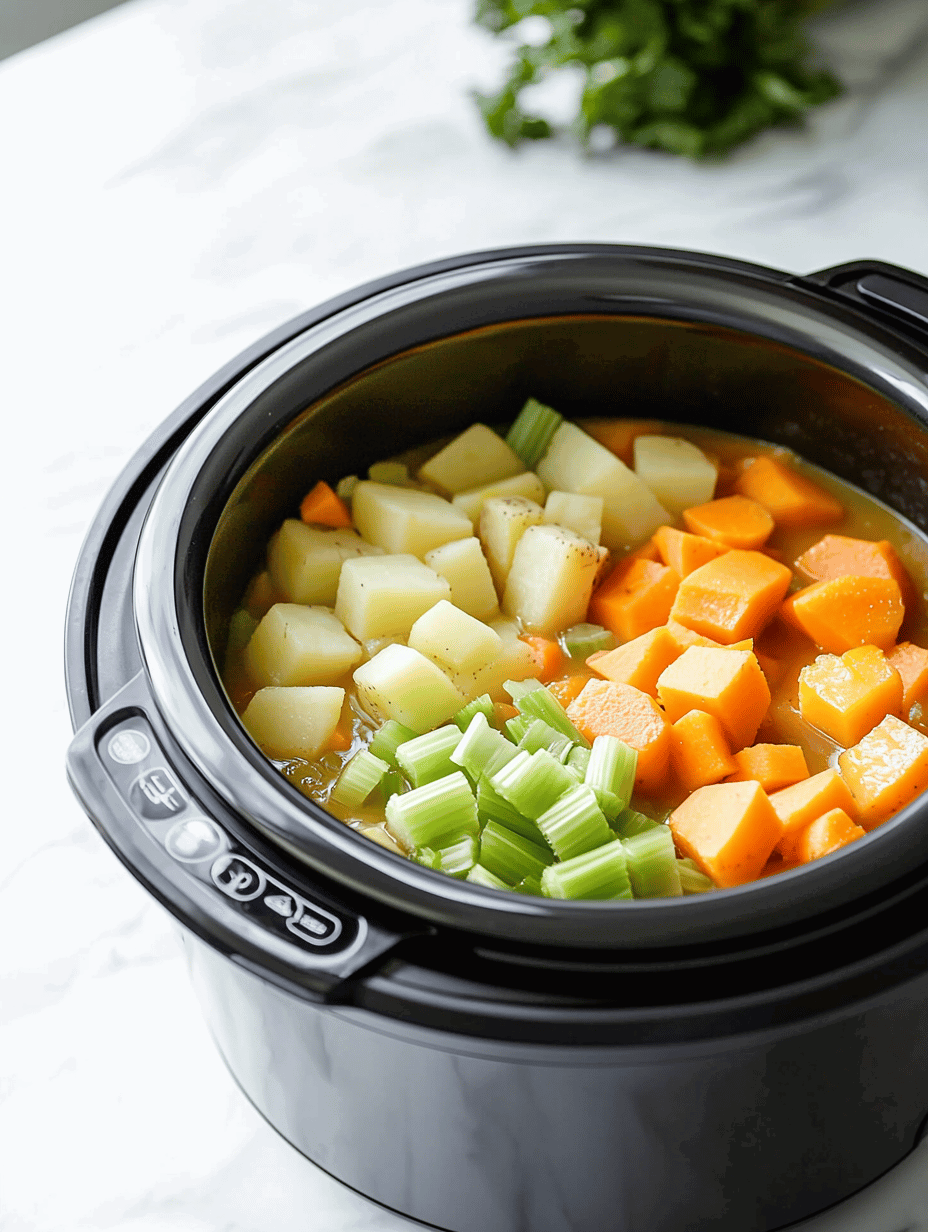 - Add the chopped root vegetables to the slow cooker along with the sautéed onion and garlic. Pour in vegetable broth, then sprinkle in ground cinnamon, salt, and pepper to taste to build layered flavors.