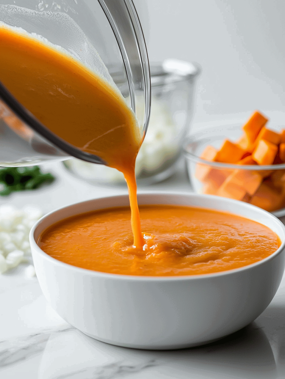 - Once cooked, carefully transfer the mixture to a blender or use an immersion blender directly in the slow cooker. Puree until smooth and creamy, with a vibrant orange hue. If the soup is too thick, stir in additional warm broth or water to loosen it.