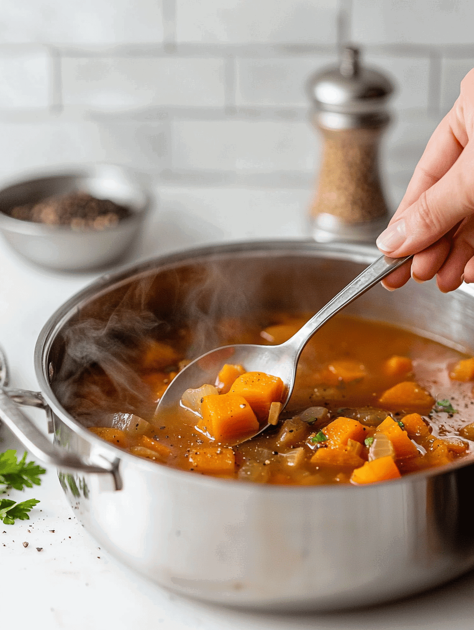 - When vegetables stick to the bottom, gently loosen with broth and scrape — flavorful bits stay.