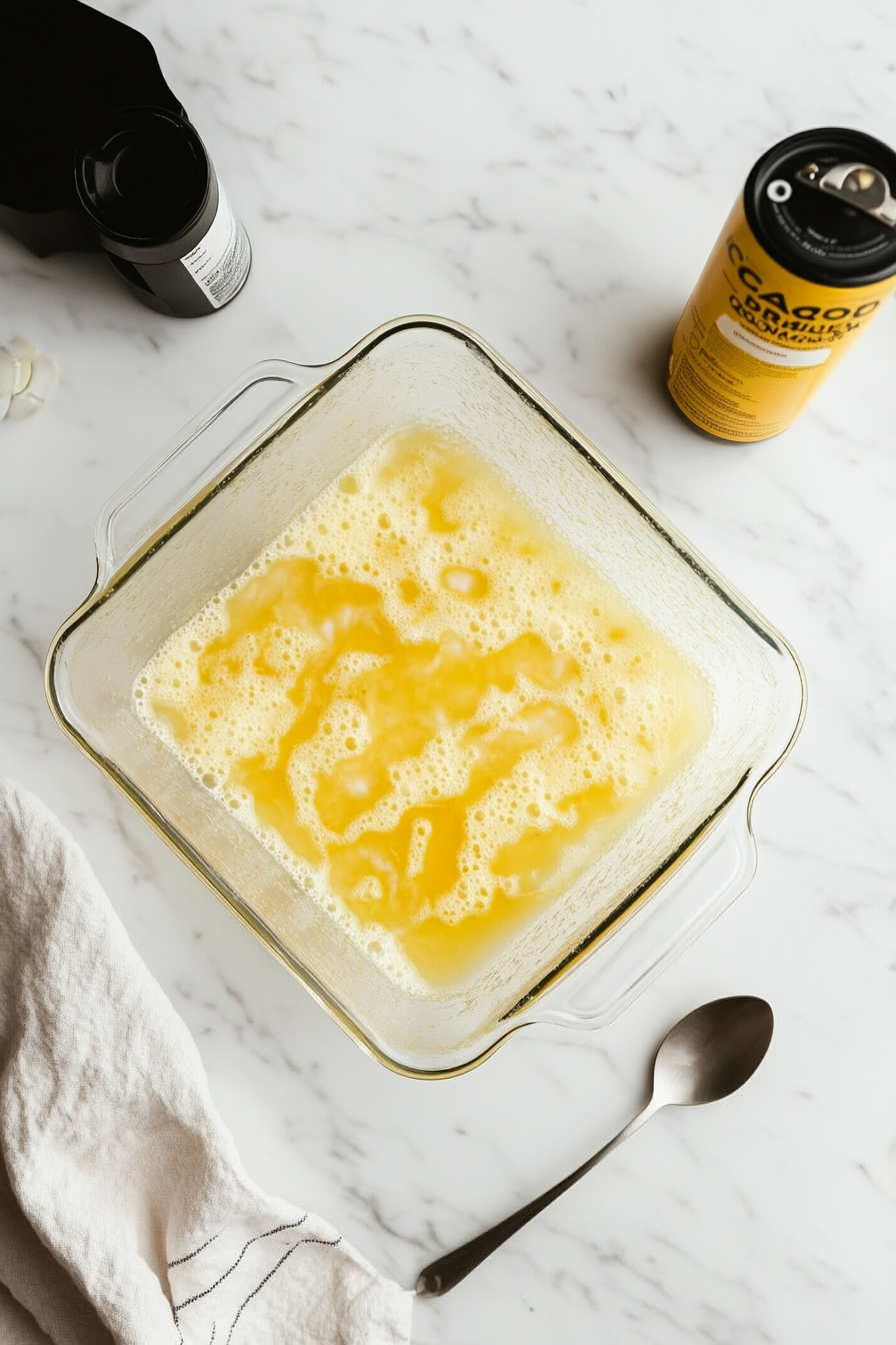 A top-down view of a transparent glass baking dish being coated with canola oil cooking spray, placed on a clean white marble countertop. This step is essential to ensure the chicken does not stick during baking and gets a golden crust. The canola spray can is also visible beside the dish. The image highlights the simplicity and practicality of prepping bakeware for chicken parmesan, emphasizing cleanliness and readiness for baking. The dish remains the focal point, with no distractions in the background, showing a clean kitchen space during the preparation process.