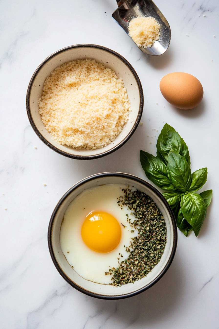 A top-down view showing two shallow glass bowls placed side-by-side on a white marble countertop. One bowl contains a beaten egg for the egg wash, while the other holds a well-mixed blend of breadcrumbs, Parmesan cheese, dried oregano, basil, thyme, and garlic powder. Measuring spoons rest nearby. This setup captures the preparation of the coating mixture for the chicken parmesan recipe. The combination of dry herbs and cheese in the breadcrumbs adds texture and flavor. The scene is clean and organized, reflecting careful ingredient preparation in a bright kitchen environment.