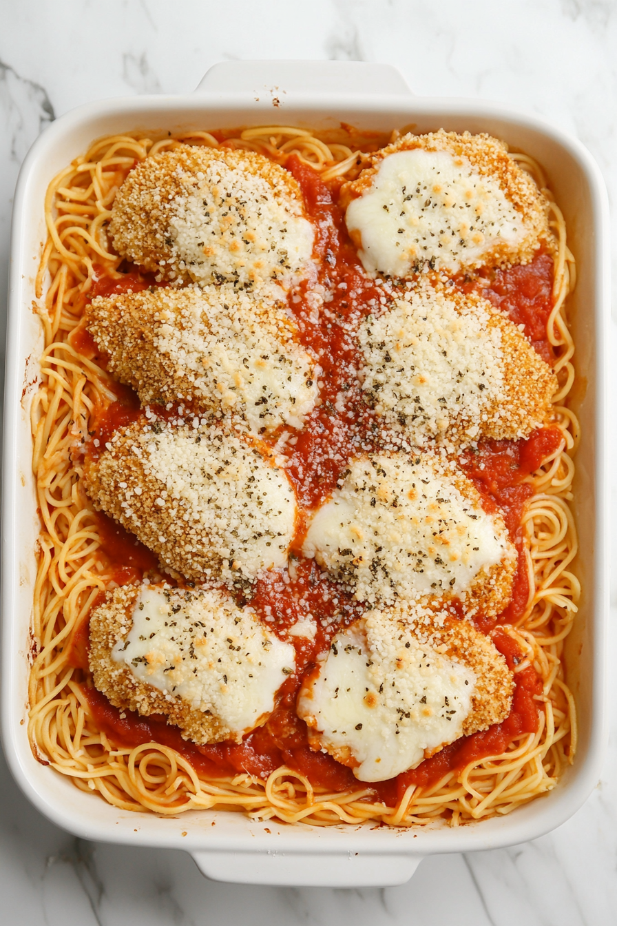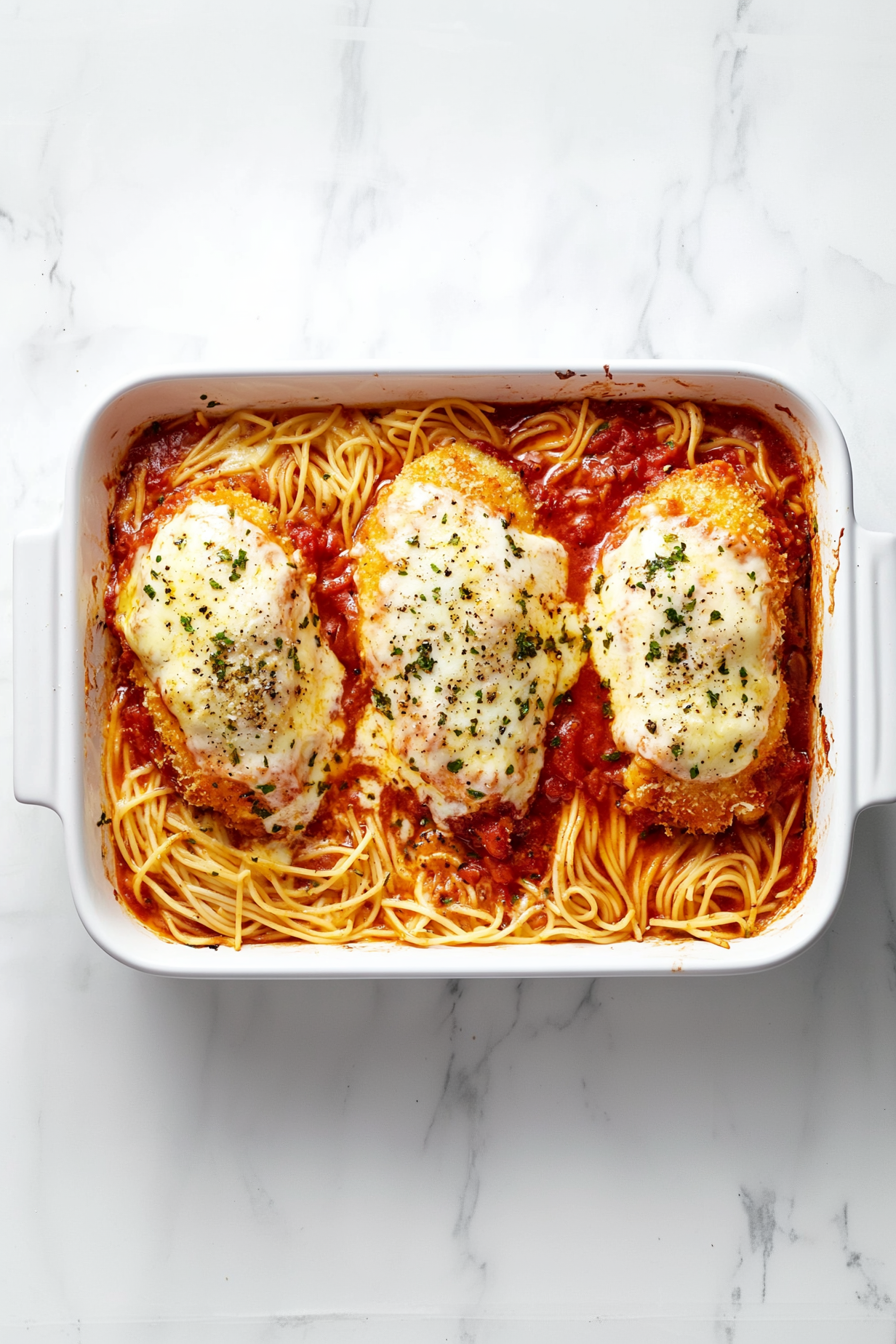 A delicious top-down view of freshly baked chicken parmesan served in a clear glass baking dish, set on a clean white marble countertop. The golden brown breaded chicken breasts are topped with rich red spaghetti sauce and melted mozzarella cheese, finished with a sprinkle of Parmesan. The image captures the finished dish in an inviting and appetizing presentation that highlights the comforting textures and flavors of the recipe. The scene is simple and clean with a clear focus on the cheesy, saucy topping and crisp breadcrumb coating, perfect for showcasing a classic Italian-inspired meal.