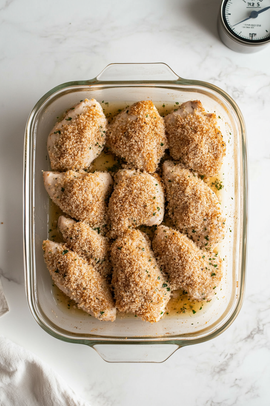 A top-down view of multiple breaded chicken breasts neatly arranged inside a clear glass baking dish, sitting on a clean white marble countertop. Each chicken piece is evenly coated with the seasoned breadcrumb mixture. This step is right before the dish goes into the oven to bake for 20 minutes. The image focuses on the readiness of the dish and showcases a smooth transition from preparation to baking. The simplicity of the scene highlights the beauty of home cooking and provides a clean, instructional representation of the process.