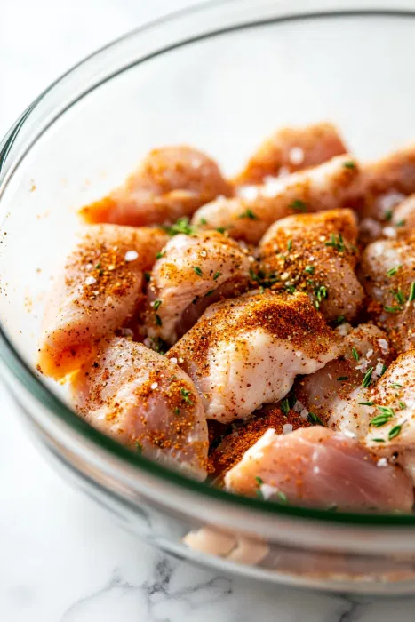 - Season the ChickenIn a mixing bowl, toss the chicken with olive oil, paprika, garlic powder, onion powder, thyme, salt, and pepper until it’s coated evenly.