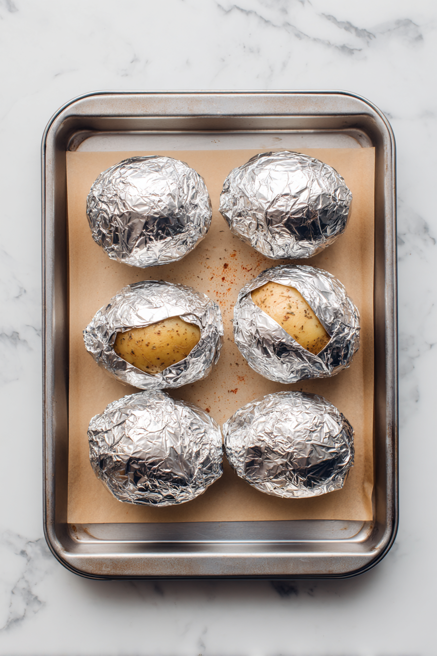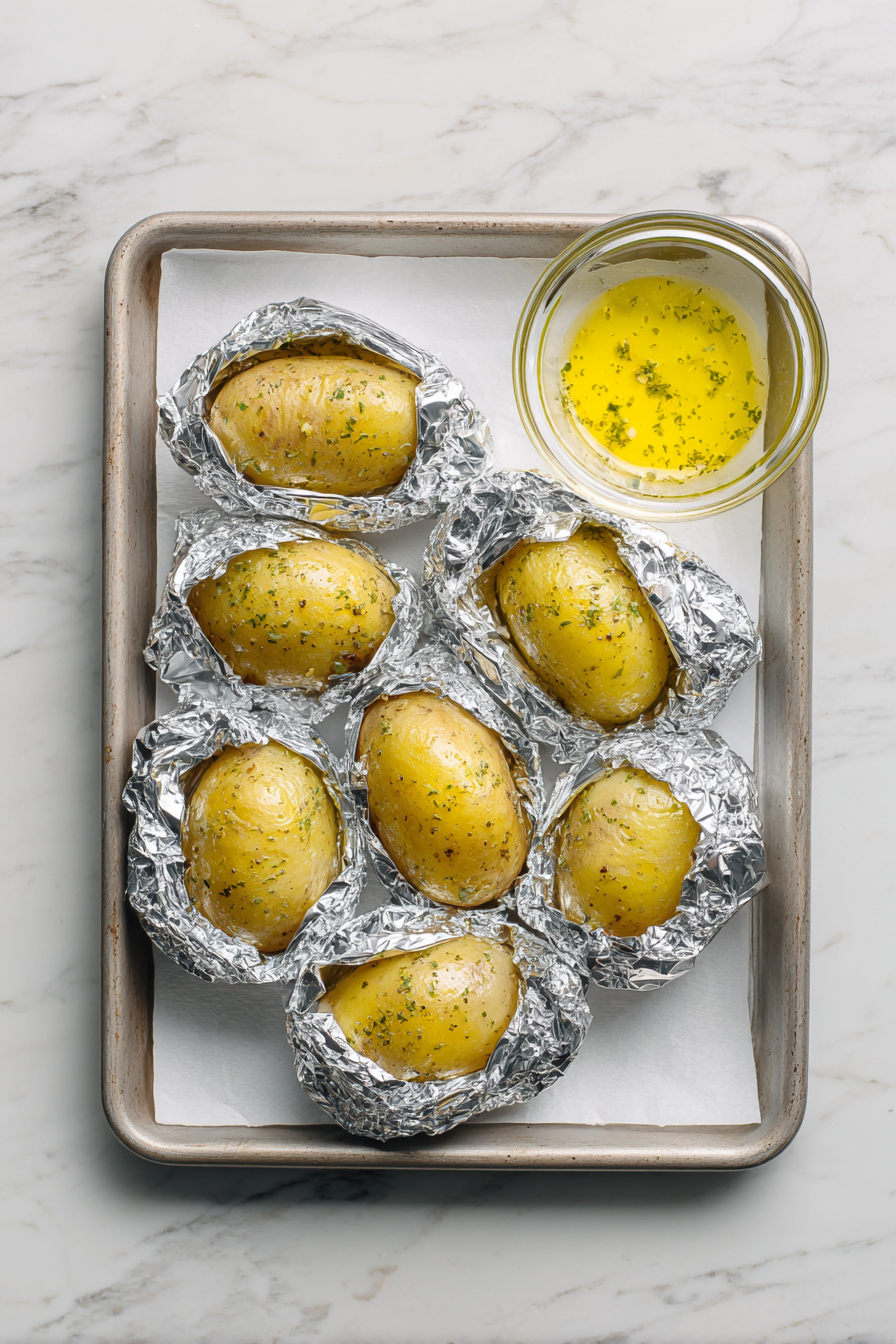- Poke holes in potatoes and coat with butter mixture, then wrap in foil.