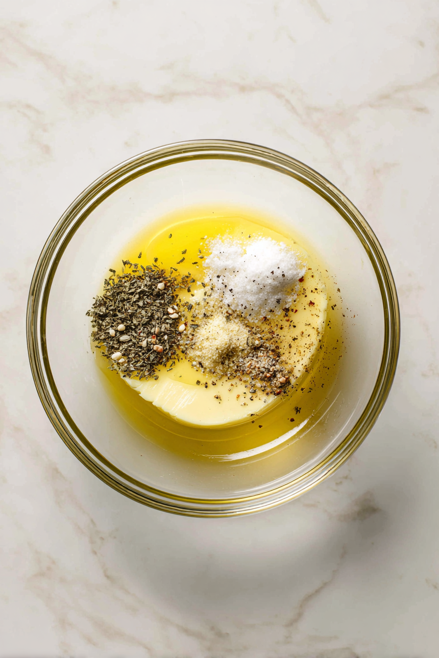 - Melt butter in a microwave-safe bowl, then mix in olive oil, garlic powder, salt, and pepper.