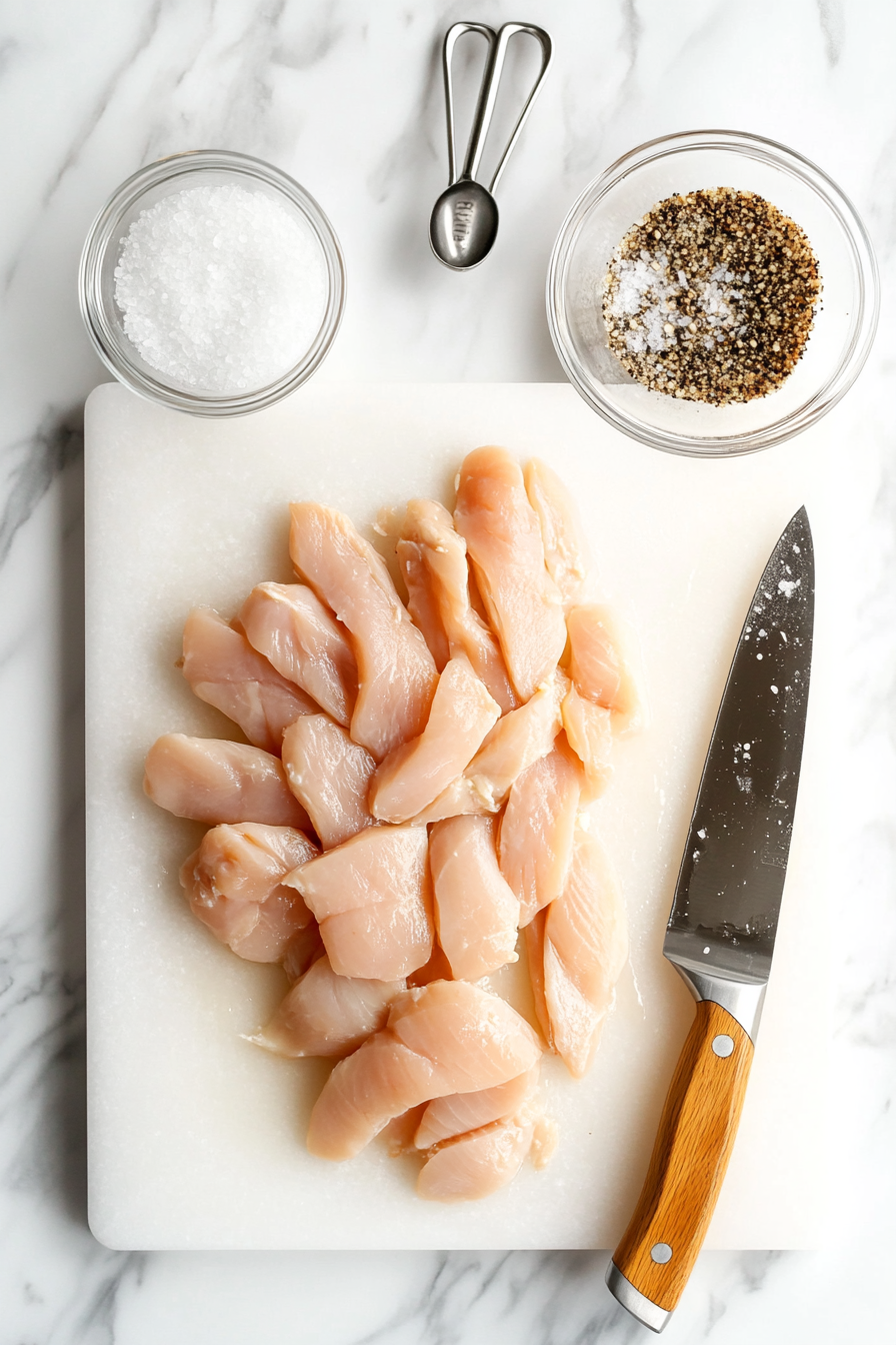 The image shows boneless, skinless chicken breast sliced into thin strips on a white cutting board placed on a white marble countertop. A chef’s knife lies next to the chicken, and a small glass bowl holds the seasoned strips. Measuring spoons filled with salt and pepper are visible, ready for seasoning. This step is crucial to ensure the chicken cooks quickly and evenly. The scene is simple and clean, capturing the freshness and preparation process before stir-frying.