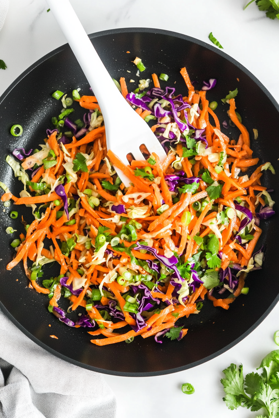 This image displays a colorful mix of chopped cabbage, julienned carrots, sliced green onions, and minced garlic being stir-fried in the same black non-stick skillet used for cooking chicken. The vegetables are bright and vibrant, indicating a crisp-tender texture. A white silicone spatula is stirring the mix over a white marble countertop. Glass bowls with the unused portion of vegetables sit nearby. This step adds freshness, crunch, and flavor to the dish, making it a balanced and nutritious meal.