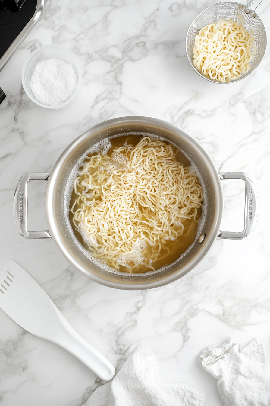 This image shows chow mein noodles being boiled in a medium-sized stainless steel pot on a clean white marble cooktop. The noodles are partially submerged in bubbling hot water, showing the early stages of softening. Steam rises gently, and a white silicone spatula rests nearby, ready to stir. This step is essential to prepare the noodles before they are added to the stir-fry. Measuring cups with extra noodles are arranged around the pot for a clean and organized prep look.