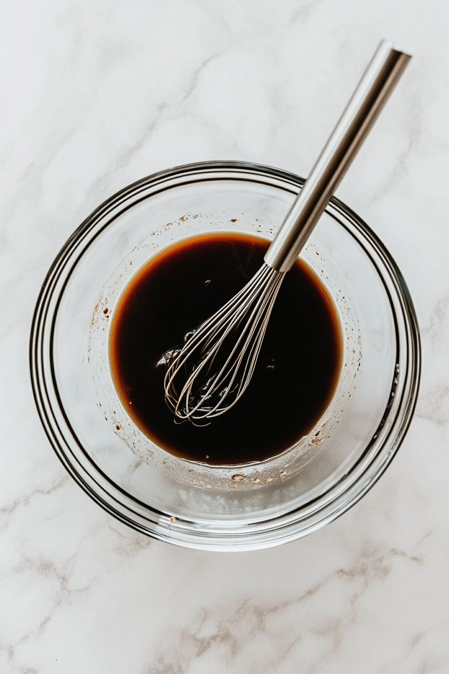 A glass mixing bowl is filled with a dark sauce mixture made from oyster sauce, soy sauce, light sesame oil, chicken broth, cornstarch, and sugar. The bowl is placed on a white marble countertop, and a silver hand whisk stirs the ingredients into a smooth sauce. Surrounding the bowl are labeled measuring spoons and small bowls containing each sauce component. This sauce is key to bringing all elements of the chow mein together with a savory, slightly sweet glaze.