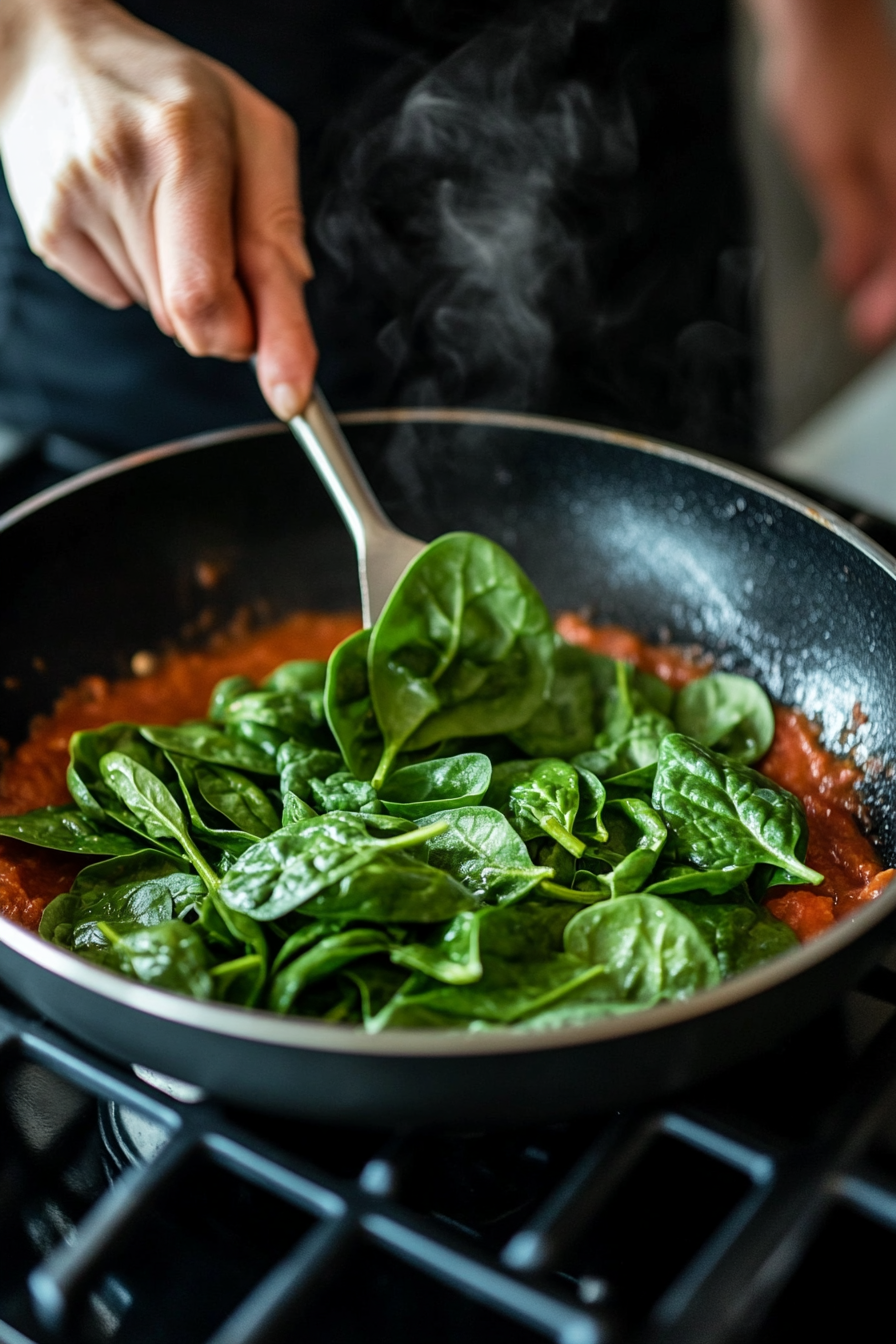 - Stir in spinach and cook until wilted. Make 3-5 wells in the sauce with a spoon.