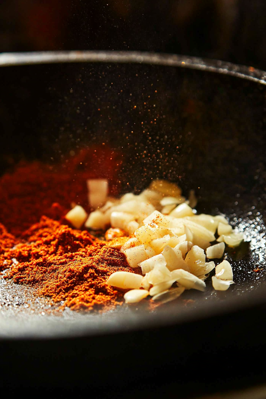 - Lower the heat to medium-low, add garlic, paprika, cumin, and optional cayenne. Stir for 30 seconds.