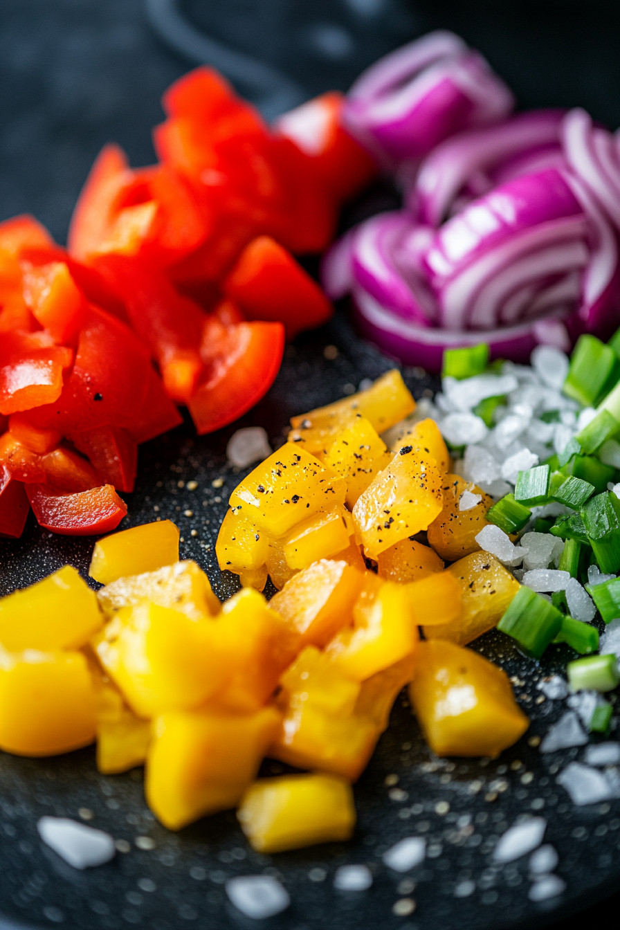 - Heat oil in a 12-inch skillet over medium heat. Sauté onion, red pepper, salt, and black pepper for 6-8 minutes until soft and translucent.