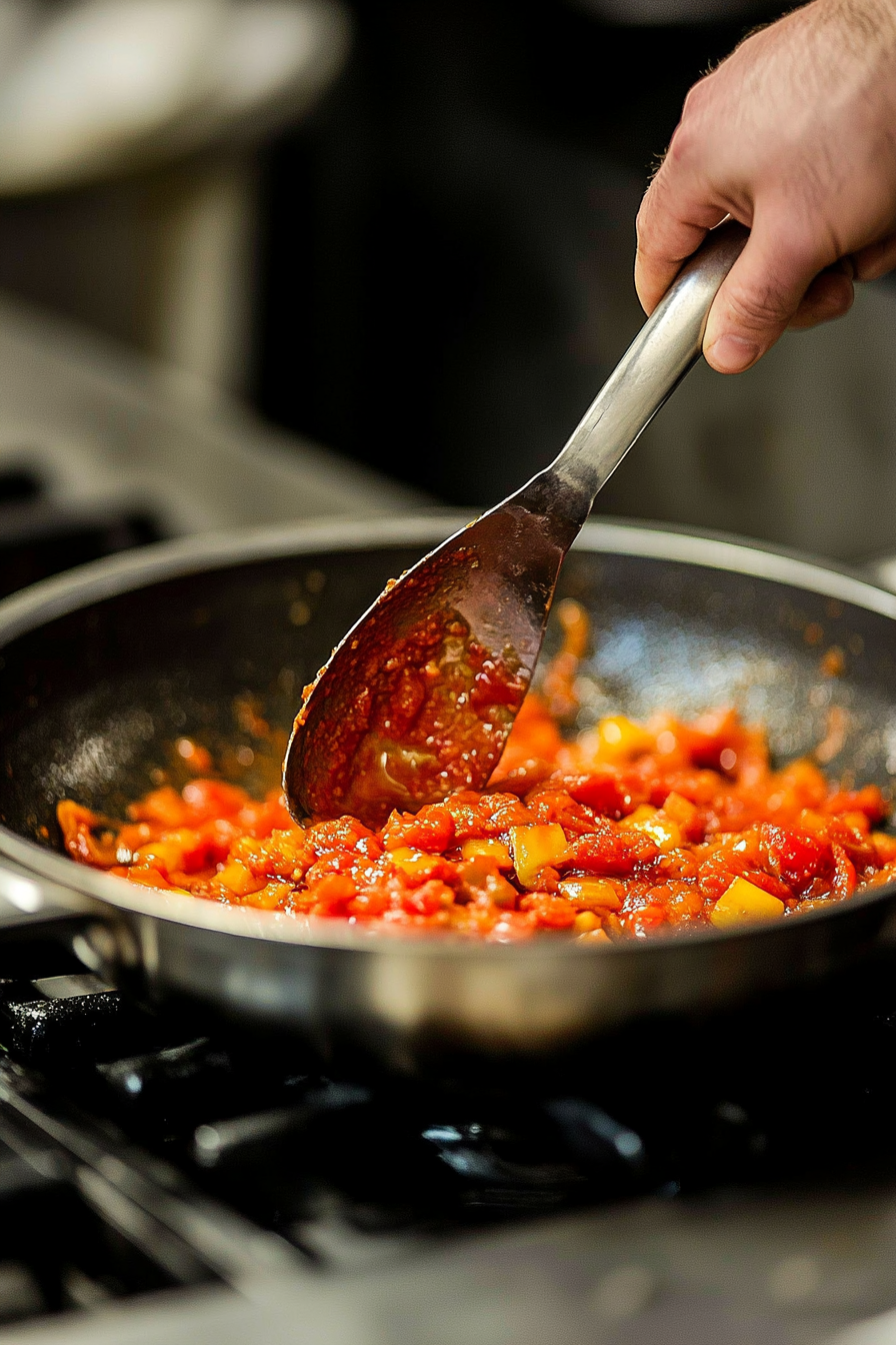 - Mix in tomatoes and harissa paste, then simmer for 15 minutes until the sauce thickens.