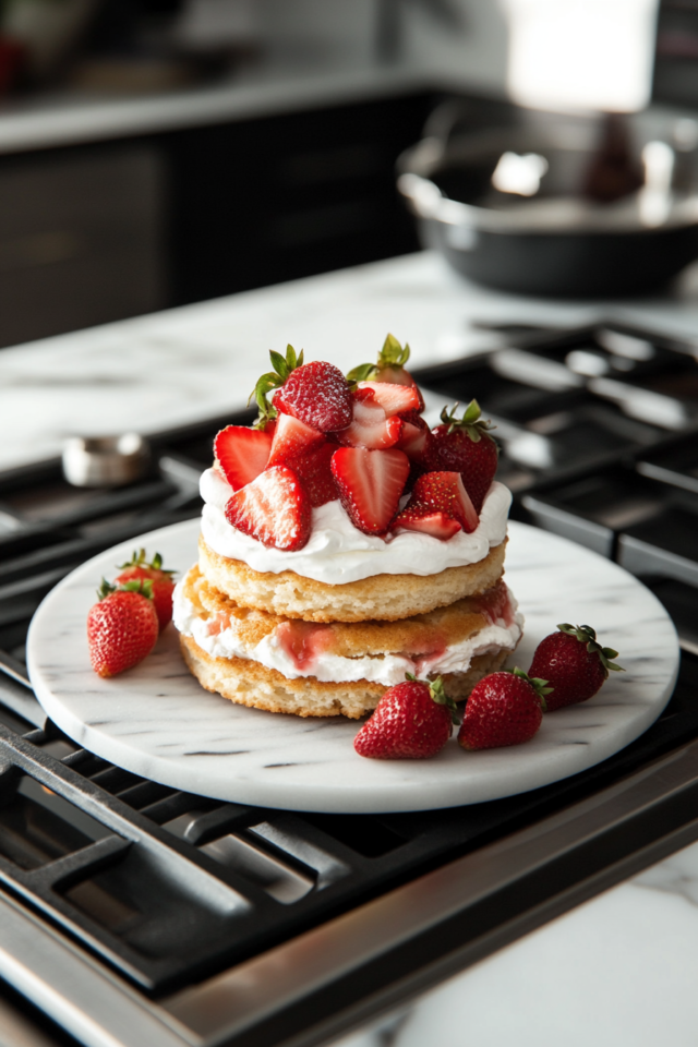 This classic dessert gets Valentine’s twist, with tender shortcake biscuits nestled under layers of sweetened strawberries and fluffy whipped cream. The biscuit-like base, golden and slightly crumbly, pairs perfectly with the juicy, macerated strawberries that release their natural sweetness.
