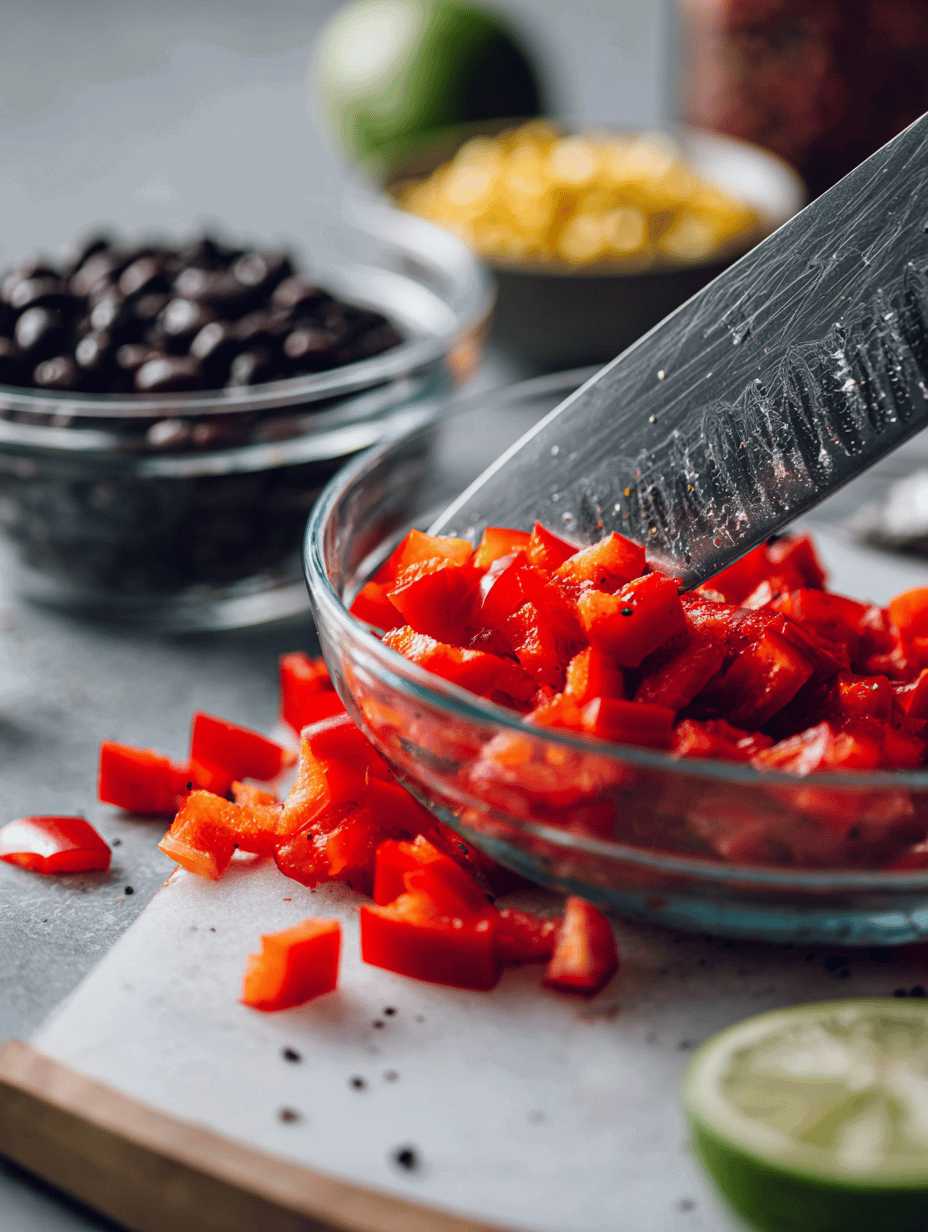 - Dice the red bell pepper into small pieces, then add to the bowl along with the drained beans.