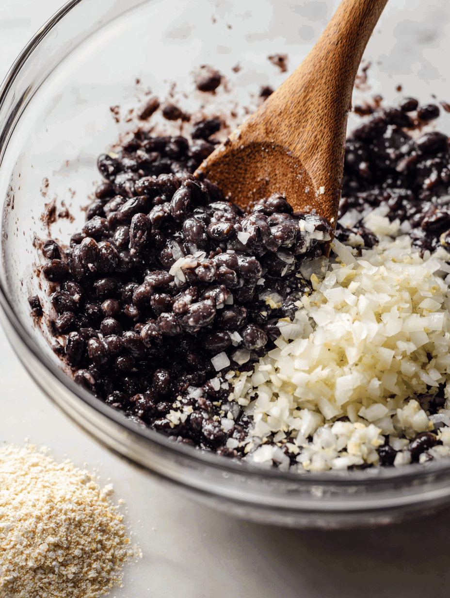 - Add finely chopped onion and minced garlic to the mashed beans, then sprinkle in the oats or breadcrumbs. Mix everything together until well combined, forming a sticky, cohesive mixture.