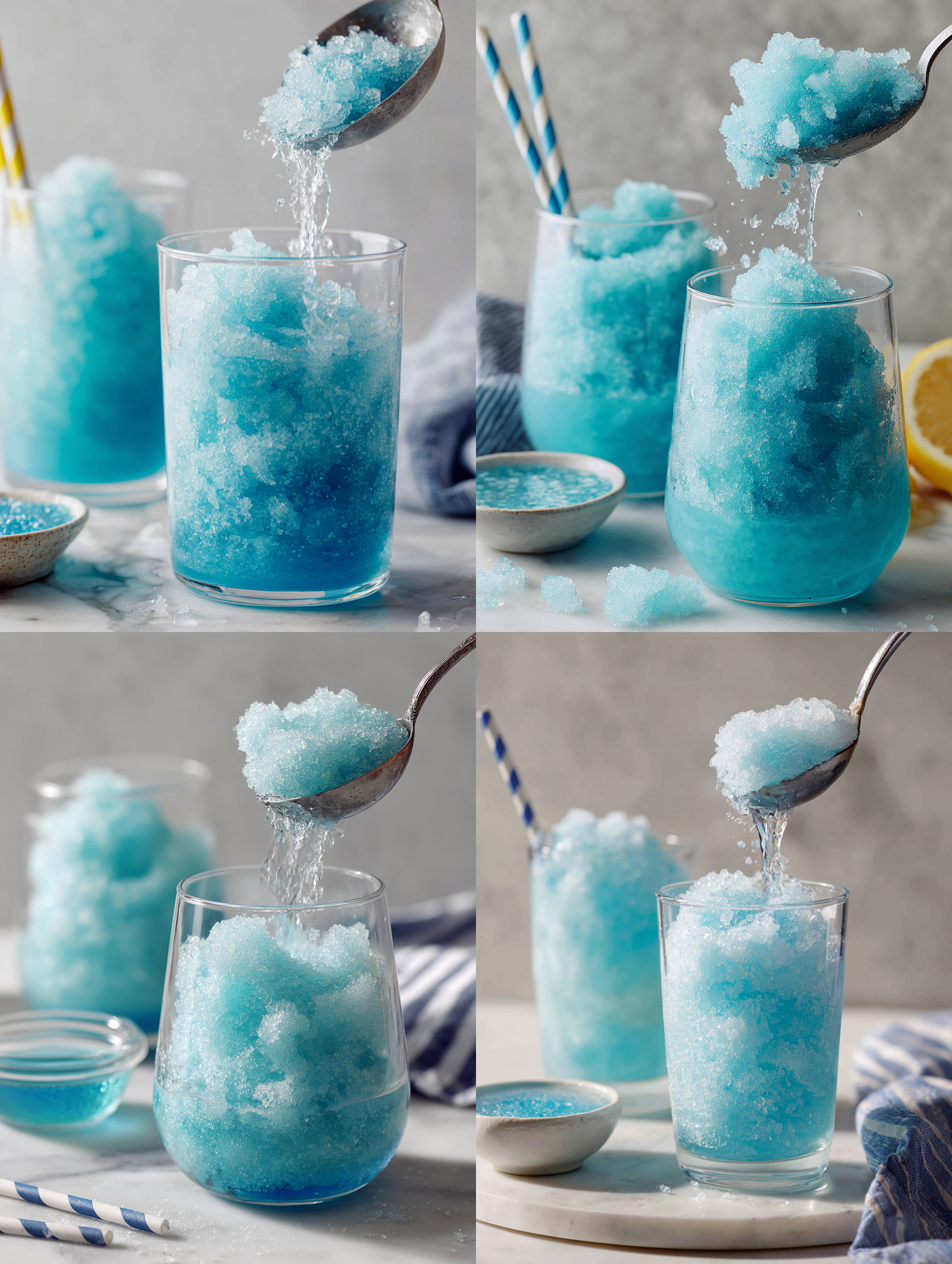 - Pour the icy mixture into glasses, garnish with a straw or extra syrup if desired, and serve immediately for the best granular, snow-like texture.