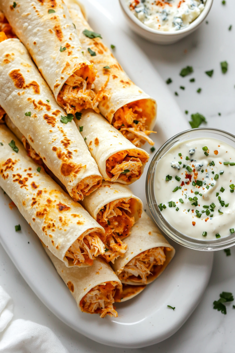 - Step 6: Serve & EnjoyArrange the taquitos on a platter, drizzle a little extra buffalo sauce over the top, and serve with the dip. Garnish with extra chives or crumbled blue cheese if you’re feeling fancy.