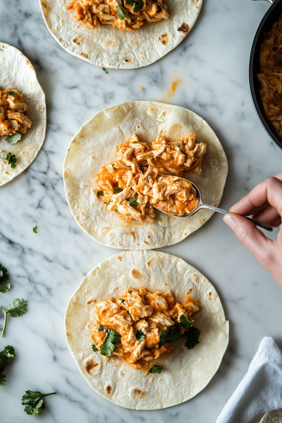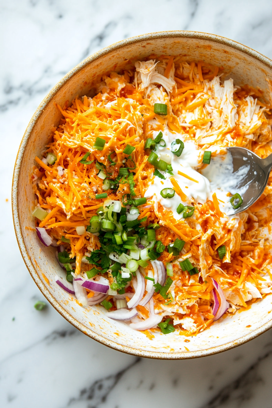 - Step 1: Prep the FillingIn a mixing bowl, combine shredded chicken, buffalo sauce, melted butter, and cheese. Stir until the chicken is evenly coated, glossy, and rich. The scent should be tangy and buttery that’s your flavor base.