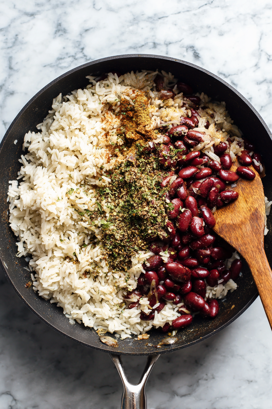 - Stir in rice, beans, and jerk seasoning; mix well.