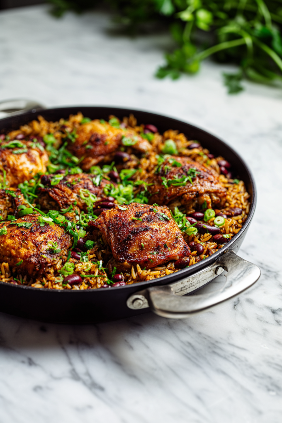 From the moment you sear those seasoned chicken thighs to the first spoonful of creamy coconut rice studded with kidney beans and fragrant thyme, this recipe delivers warmth, spice, and soul in every bite.
