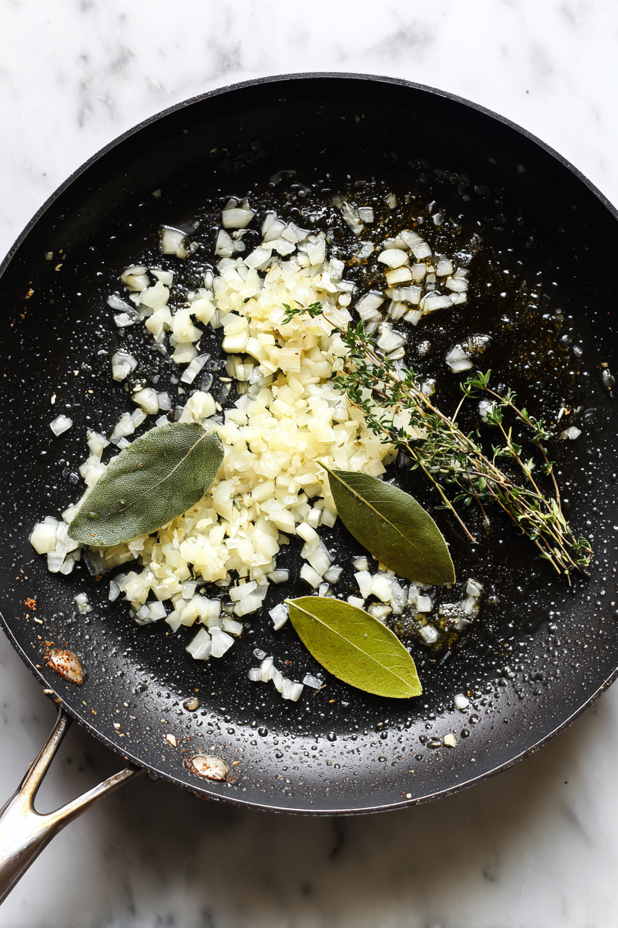 - Sauté onions, garlic, thyme, and bay leaves in the same pot.