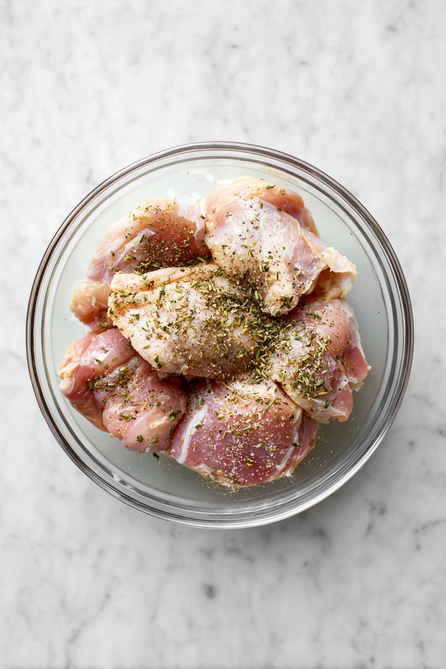 - Season chicken thighs with salt, bouillon, and jerk seasoning.