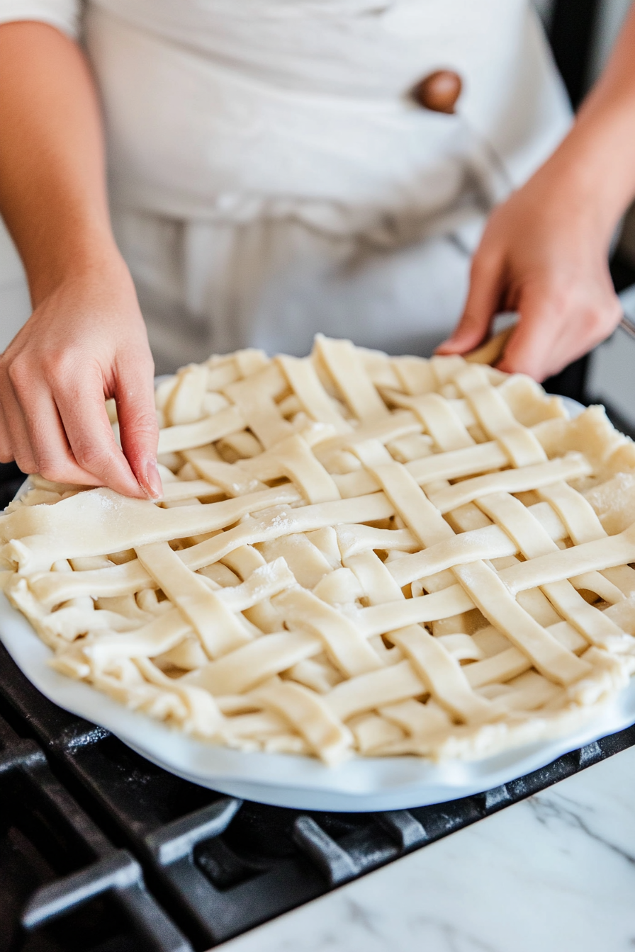 - Finish crust: Arrange the lattice or braids, trim and crimp edges, and brush with egg wash.