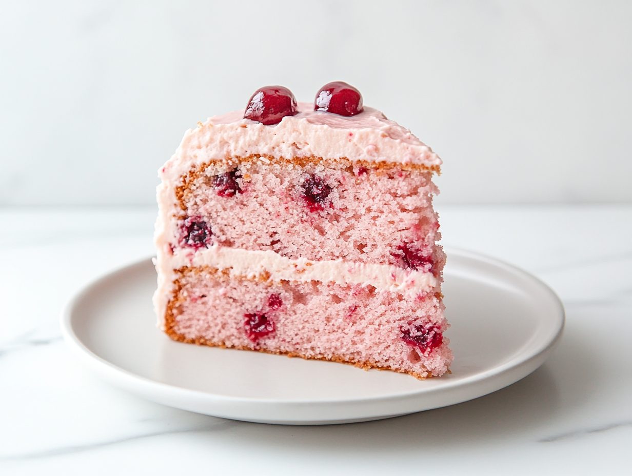 Every slice of this cake is packed with sweet cherry flavor and has a lovely pink color, thanks to the maraschino cherry juice we add.