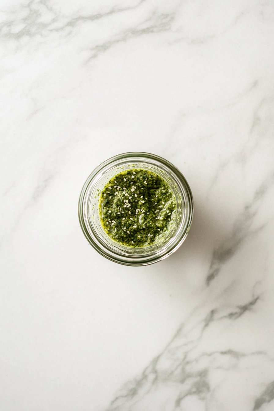 Prepare the green chili paste and sesame seed paste by grinding fresh ingredients until smooth.