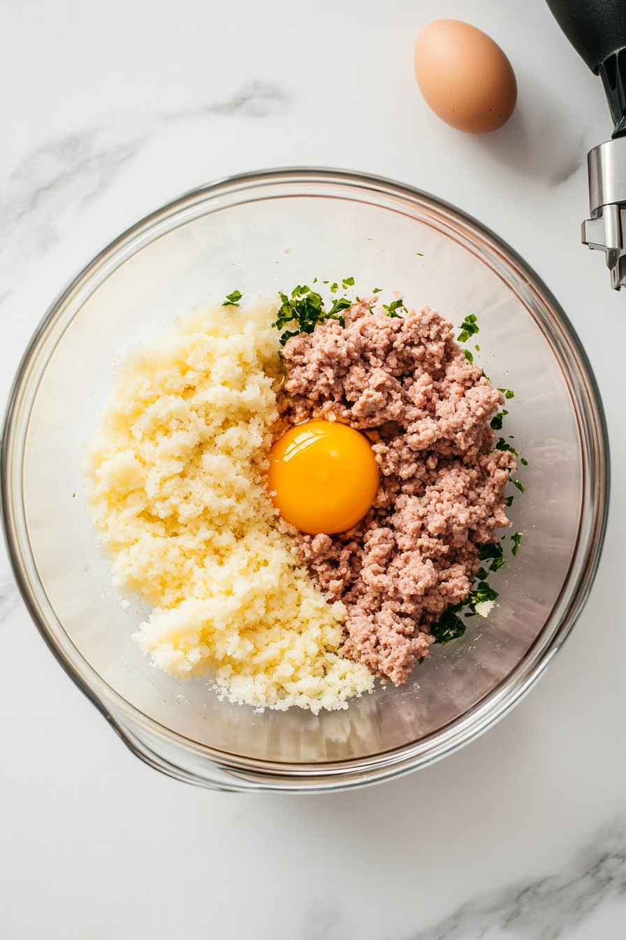 • In a mixing bowl, combine ground chicken, half the bread crumbs, grated onion, minced garlic, and egg.