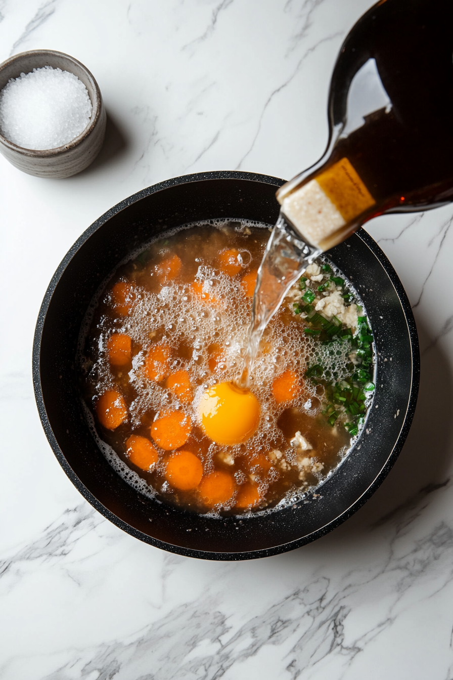 • Pour in boiling water, soy sauce, chicken bouillon cube, salt, and sugar. Stir well.