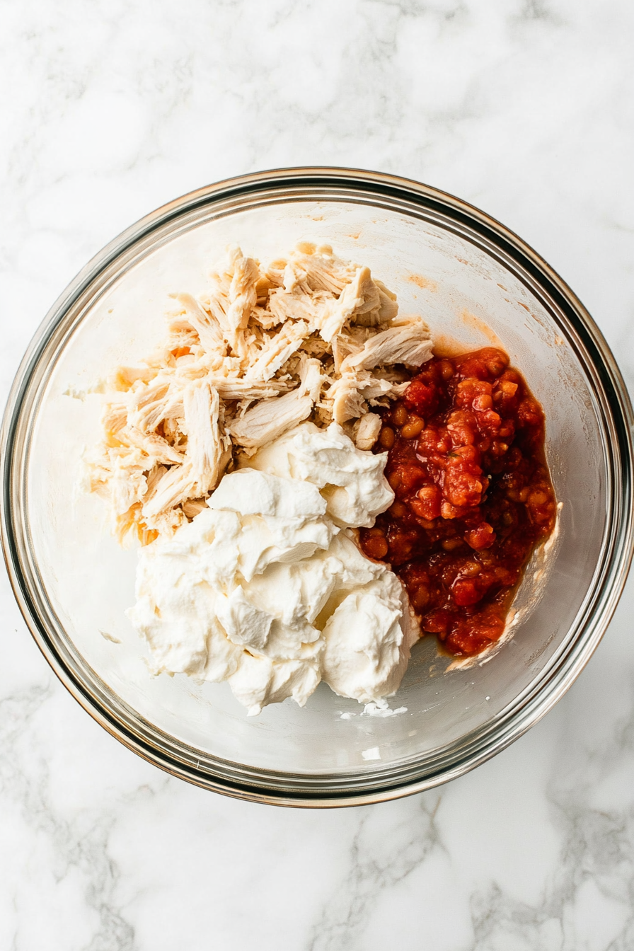 - In a mixing bowl, combine cream cheese, salsa, chopped cooked chicken, and pinto beans until well blended.