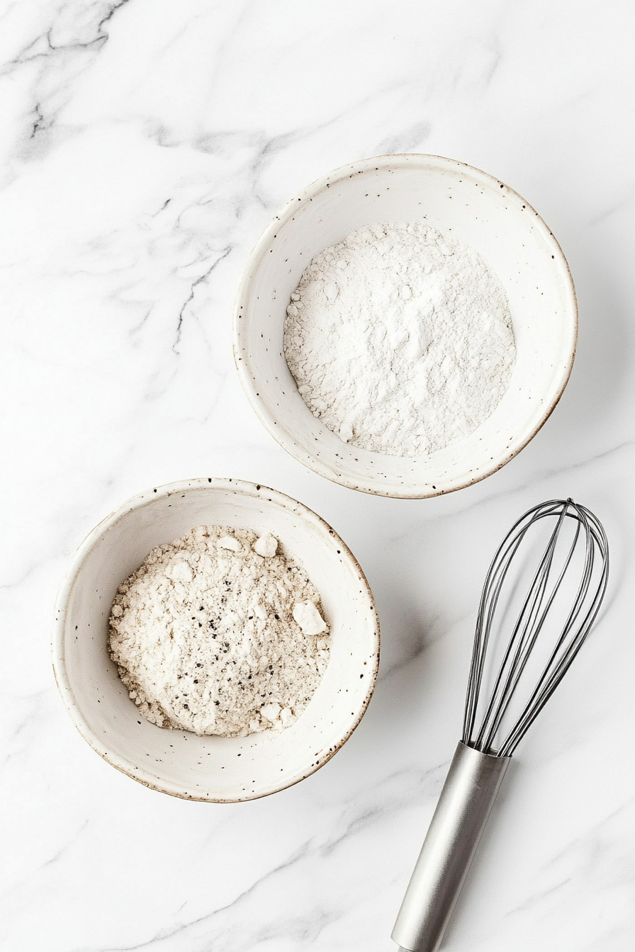 - In one shallow bowl, mix flour, salt, and pepper. In another, whisk eggs and milk.