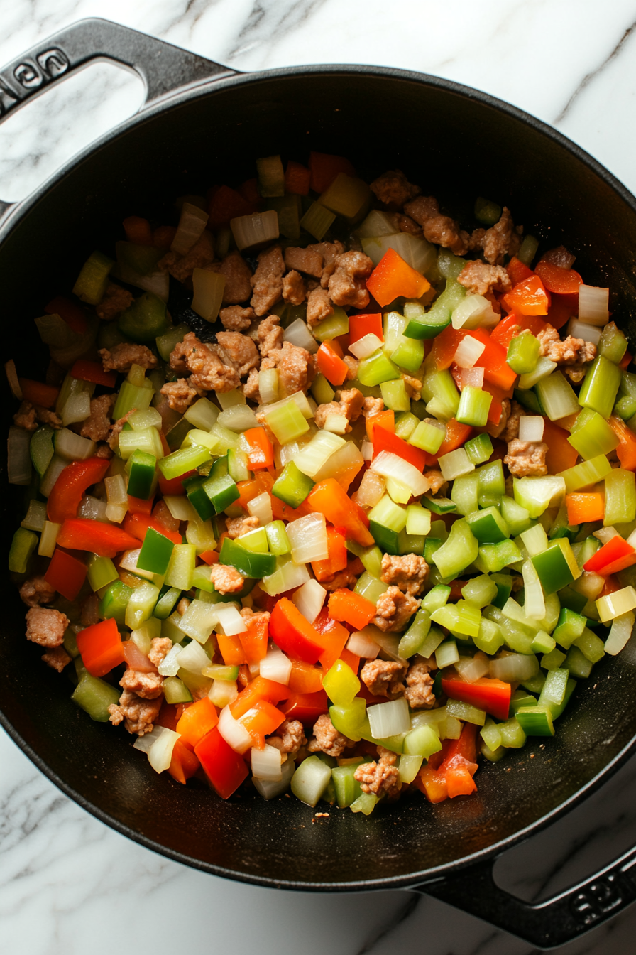 - Add remaining oil, then sauté onion, celery, and bell peppers until soft.