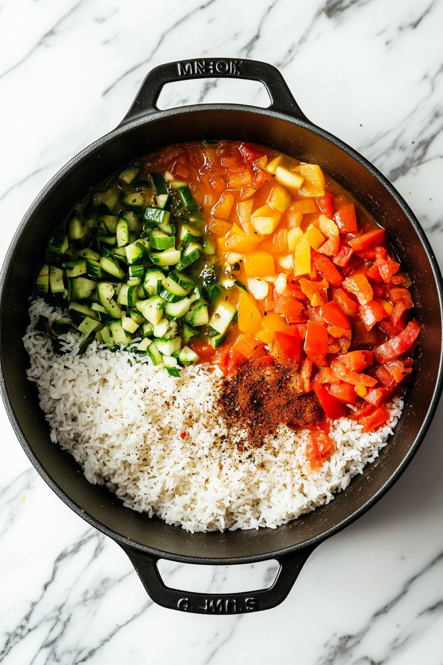 - Pour in crushed tomatoes, chicken broth, and rice. Stir well.