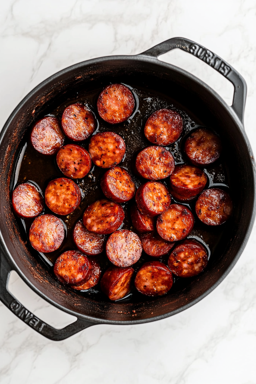 - In the same pot, cook sausage slices until lightly crisped.