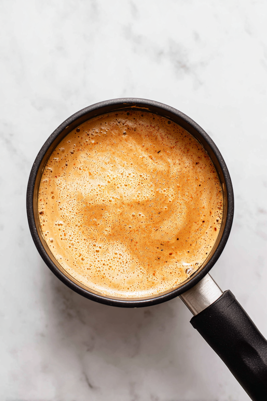 Peanut butter can catch and burn easily. Keep the heat gentle and whisk constantly for a smooth, silky sauce without grainy bits.