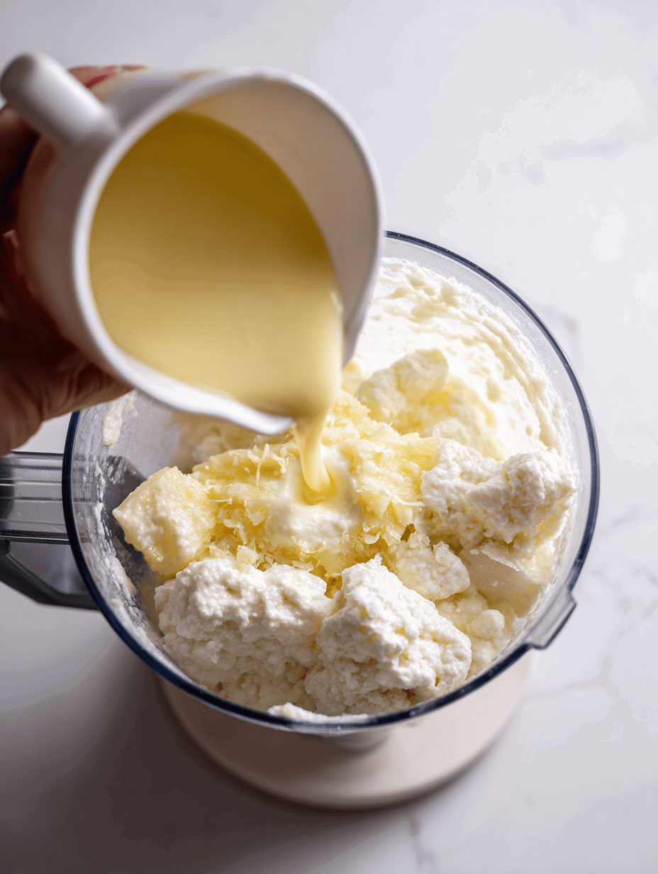 - Place the frozen pineapple chunks into your blender. Add the coconut milk and pineapple juice, then sprinkle in crushed ice until the blender is nearly full. Secure the lid tightly.