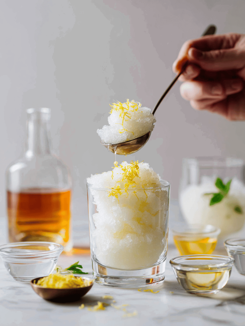 • Once the slushie is ready, scoop it into chilled glasses. Garnish with lemon zest and, if desired, a sprig of fresh mint for a fragrant finishing touch.