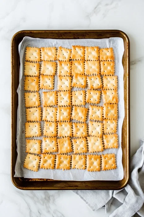 - Arrange the saltine crackers in a single layer on the baking sheet, covering the entire surface. Set aside.