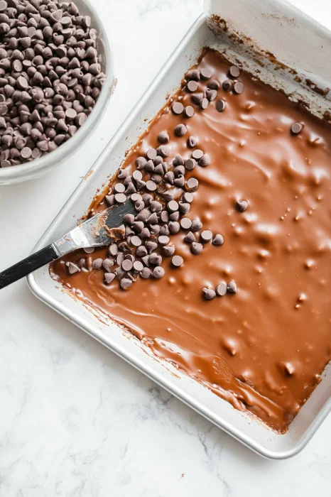 - Once the chocolate chips have softened, use a spatula or the back of a spoon to spread the melted chocolate evenly over the caramel layer.