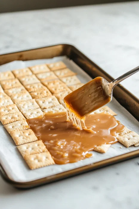 - Pour the hot caramel mixture evenly over the saltine crackers, using a spatula to spread it out if needed.