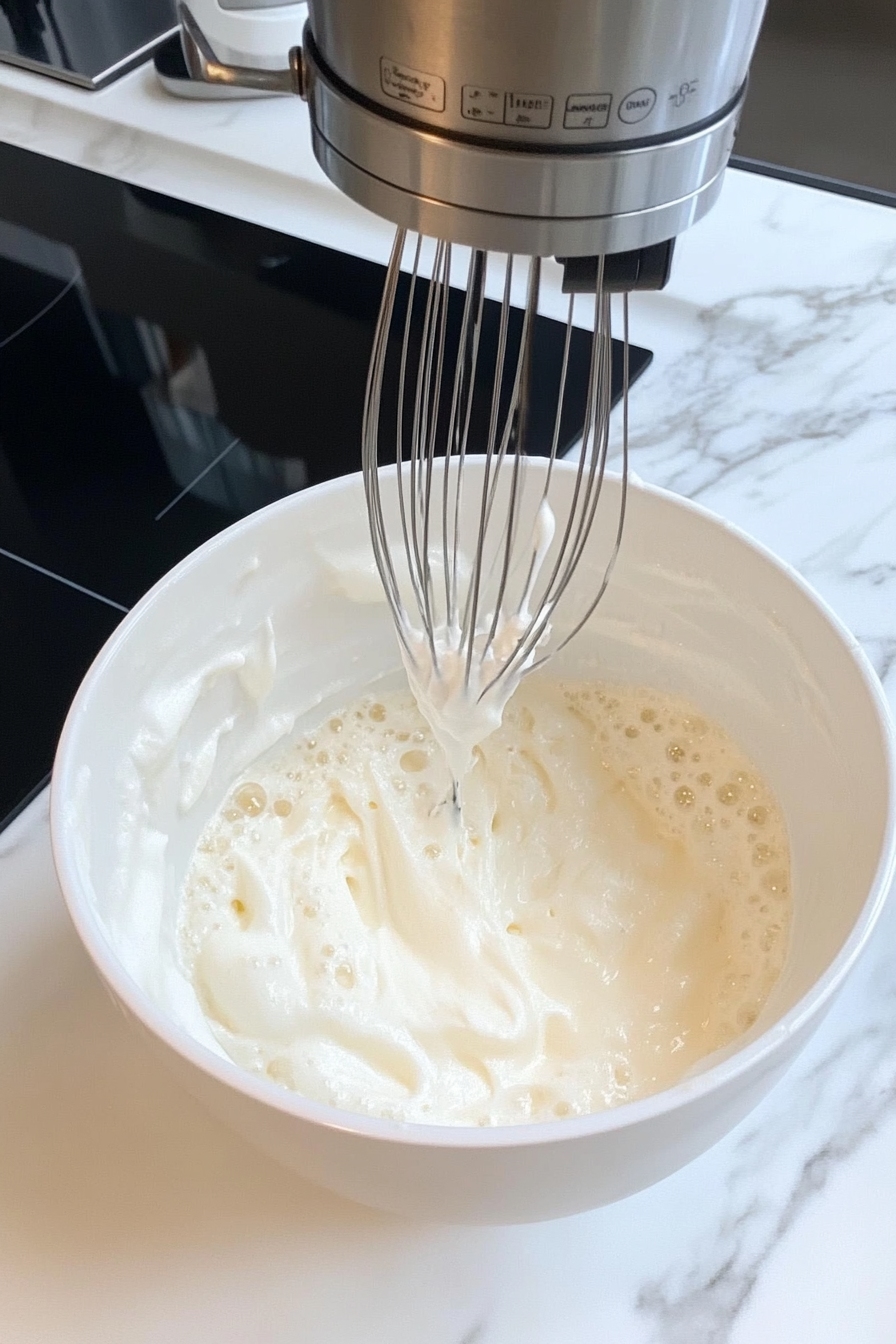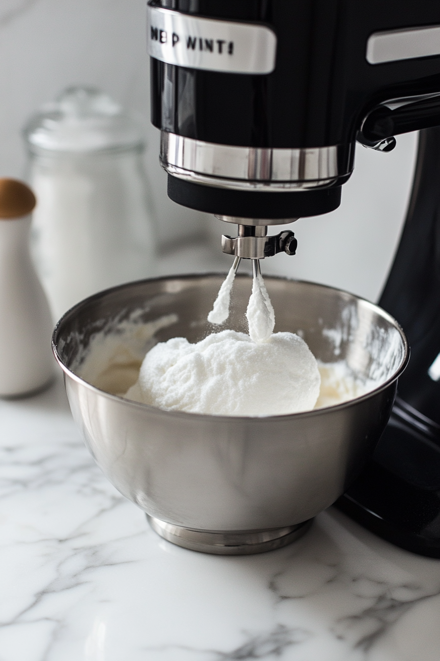 • Whisk egg whites with a stand mixer until they form stiff peaks.