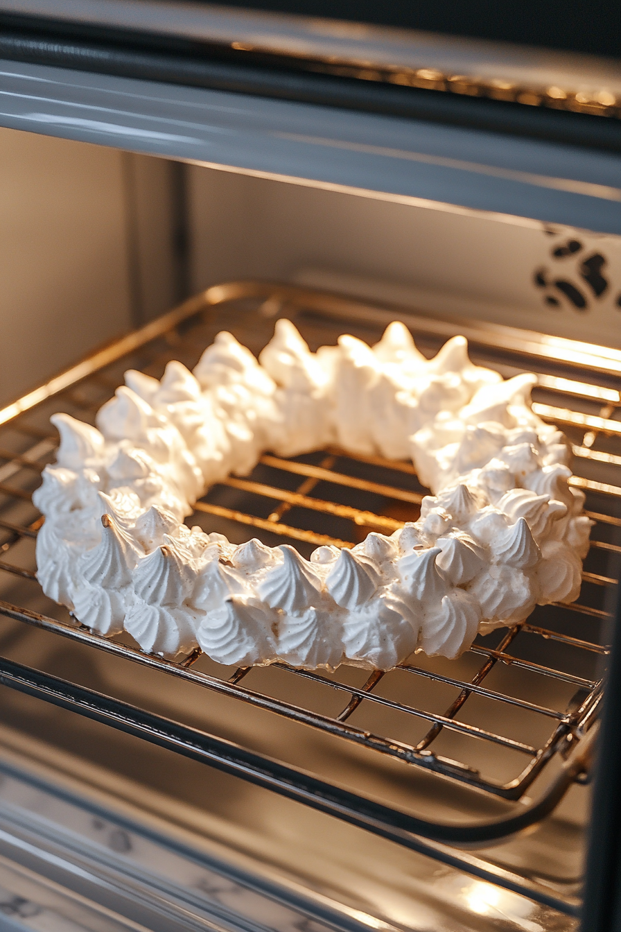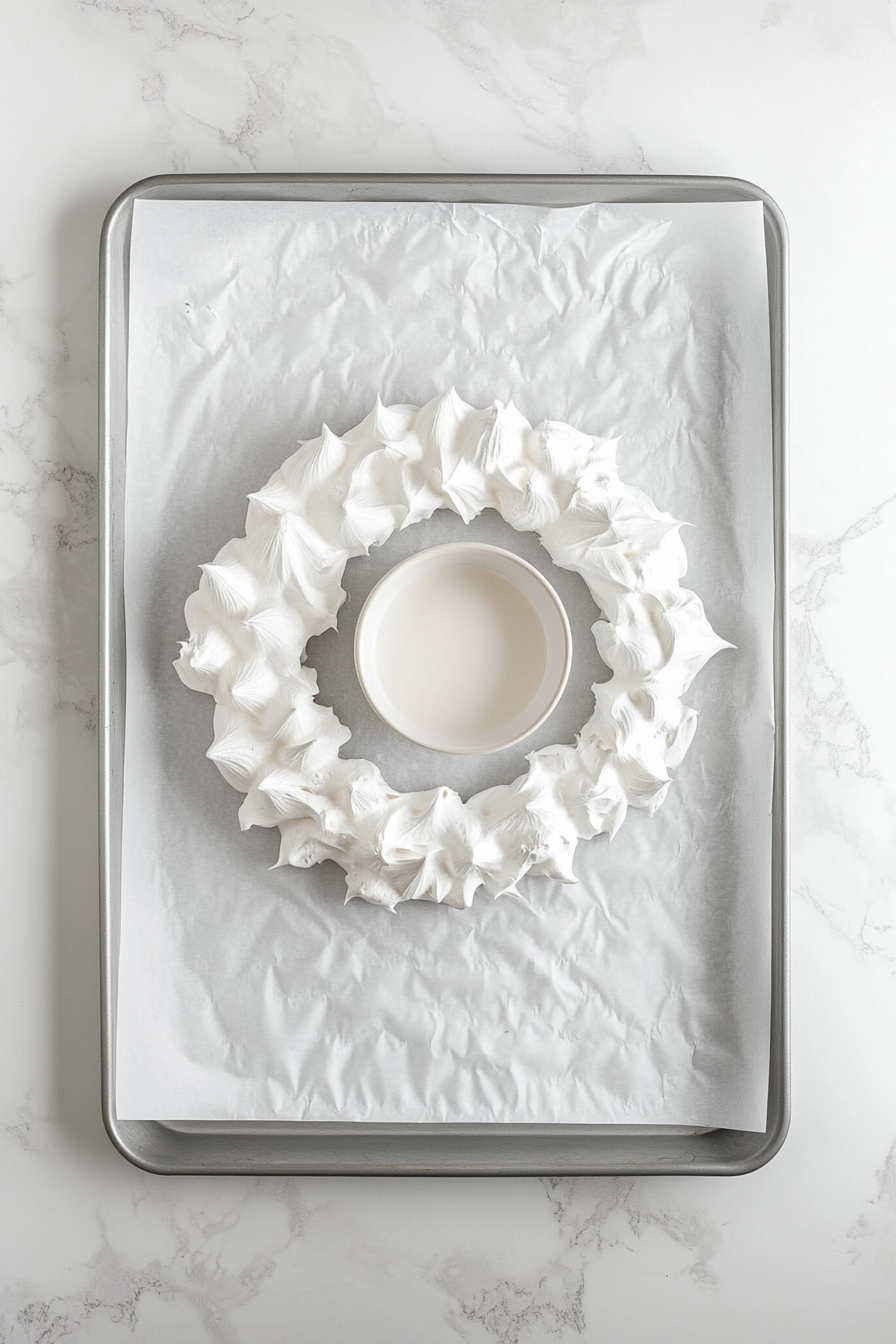• Place a small bowl in the center of the parchment paper and dollop the meringue mixture around it to form a wreath shape.